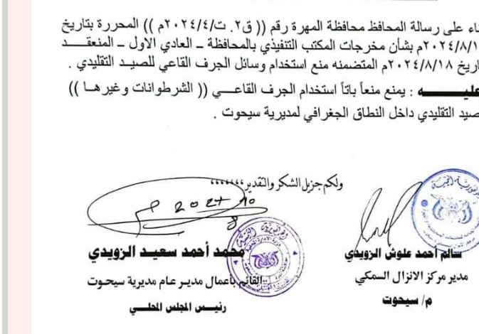أصدرت السلطة المحلية بمديرية سيحوت، تعميماً بشأن قرار المكتب التنفيذي رقم (4) بمحافظة المهرة لسنة 2024م، والذي يقضي بمنع استخدام وسائل الجرف القاعي (شرطوانات وغيرها) للصيد التقليدي داخل النطاق الجغرافي للمديرية. وجاء التعميم بناءً على قرار محافظ محافظة المهرة بشأن مخرجات الاجتماع العادي الأول للمكتب التنفيذي بالمحافظة المنعقد بتاريخ 18/أغسطس/2024م، والتضمنة منع استخدام وسائل الجرف القاعي للصيد التقليدي.