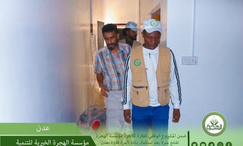 مؤسسة الهجرة تستكمل بناء المنزل الثاني من المشروع الوقفي (تجارة للآخرة) وتسلمه لأسرة فقيرة بالعاصمة عدن