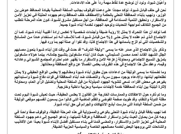 وما تضمنته ما يسمى الوثيقة من ادعاءات حول حقوق أبناء شبوة ومطالبهم لا يعكس الواقع الحقيقي ولا يمثل تطلعاتهم أبنائها، والادعاء بوجود سجون سرية، والتعسفات ضد أبناء المحافظة في قوات دفاع شبوة واستبدالهم بغيرهم هي محض افتراء، تسعى لتشويه الجهود المبذولة من قبل السلطة المحلية وتضليل الرأي العام، ومحاولة لإثارة البلبلة بين أبناء المحافظة خدمة لأجندات سياسية وحزبية داخلية وخارجية.