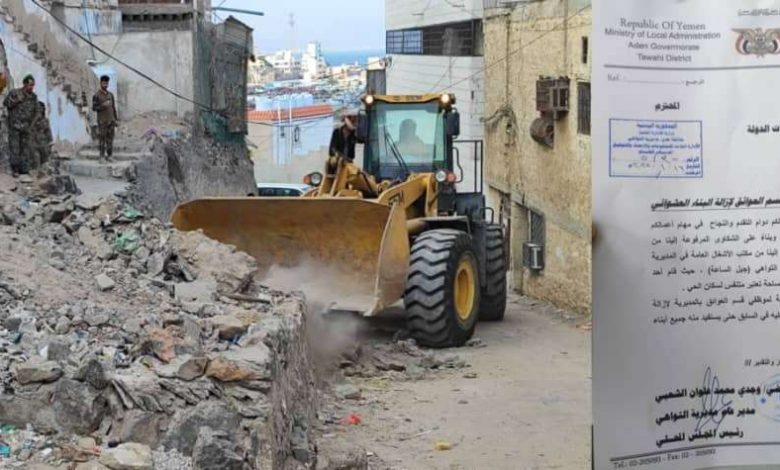 نفذت وحدة حماية الأراضي صباح اليوم الأحد نزول حماية مع اشغال مديرية التواهي بعدن لإزالة بناء عشوائي مستحدث.