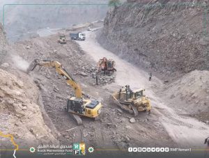 و يواصل الطاقم الفني والهندسي للجهة المنفذة أعماله في توسعة النقيل من أعمال شق ودك وانشاء جوانب الحماية ومعالجة التدهور الذي تعرض له الطريق في الفترات السابقة.