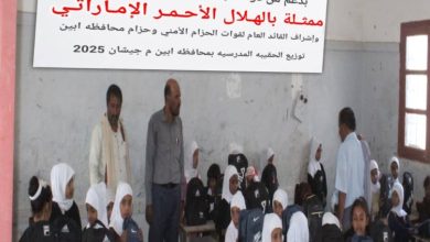 الهلال الاحمر الإماراتي يدشن توزيع الحقائب المدرسية بمديرية جيشان