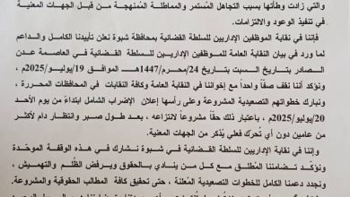 في بيان قوي.. نقابة موظفي السلطة القضائية في شبوة تعلن تأييدها للإضراب الشامل وتؤكد على ضرورة انتزاع الحقوق