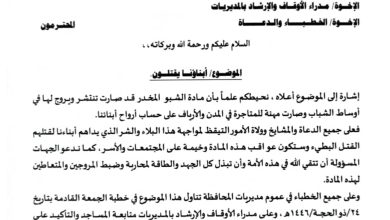 أبين ميديا /شبوة / محضار المعلم أصدر مكتب الأوقاف والإرشاد بمحافظة شبوة بقيادة الشيخ محسن محمد بن حسين بن أحمد…