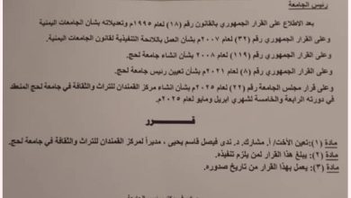 أبين ميديا- لحج – عبدالحكيم الصيعري أصدر الأستاذ الدكتور أحمد مهدي فضيل رئيس جامعة لحج قراراً بتعيين أ.د. ندى فيصل…