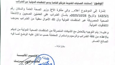 وزير المالية يوجّه بإلغاء ضريبة الـ15% على مستحقات العاملين الصحيين الممولة من المنظمات الدولية