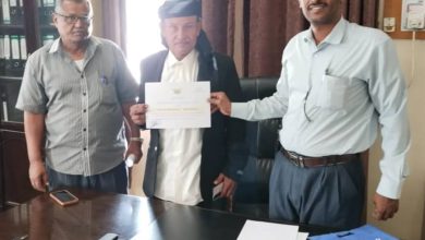 مدير عام مكتب الأشغال بشبوة يكرم نائب مدير مكتب الأشغال بمديرية نصاب نظير جهوده في الأداء
