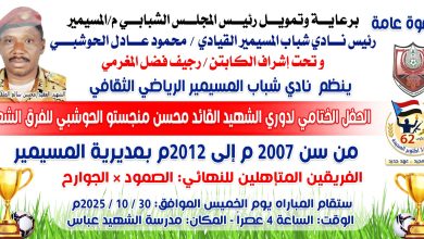 برعاية القيادي محمود عادل الحوشبي… الجوارح والصمود وجهًا لوجه غدًا الخميس في نهائي بطولة الشهيد منجستو بحضور رسمي وشعبي