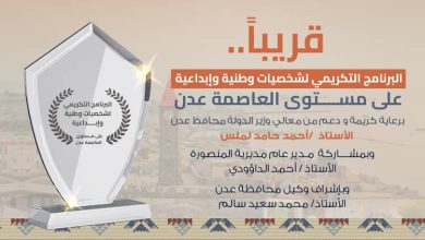 أبين ميديا /العاصمة عدن تترقب الأوساط الاجتماعية والثقافية في العاصمة عدن انطلاق البرنامج التكريمي الكبير لشخصيات وطنية وإبداعية ، برعاية…