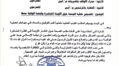مكتب الأوقاف والإرشاد بأبين يوجه مكاتبه بالمديريات والخطباء والمرشدون بتخصيص خطبة الجمعة للتوعية حول مخاطر الاوبئة والوقاية منها
