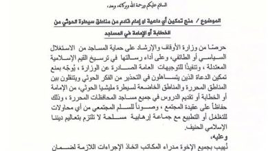 وزارة الاوقاف توجه بمنع تمكين أي جماعة أو إمام قادم من مناطق سيطرة الحوثي من الخطابة أو الإمامة في المساجد