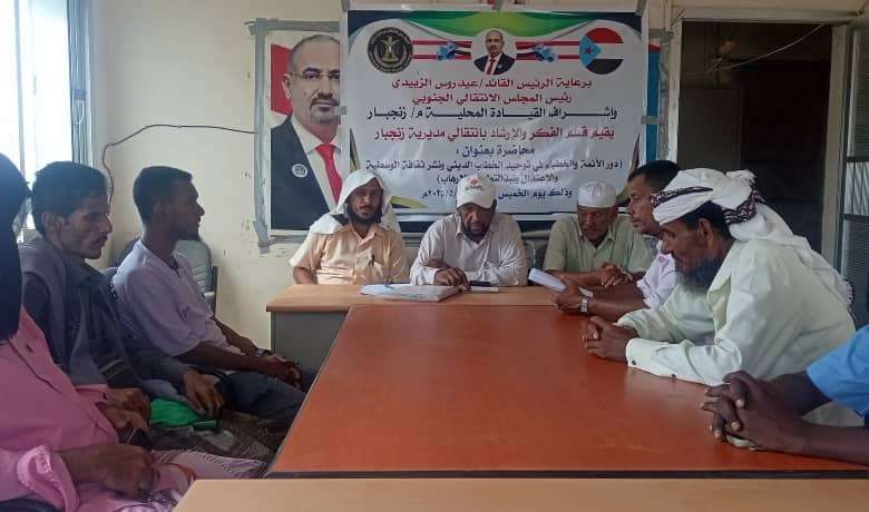 نظم قسم الفكر والارشاد بالهيئة التنفيذية للقيادة المحلية بالمجلس الإنتقالي الجنوبي مديرية زنجبار محافظة أبين، اليوم الخميس، محاضرة بعنوان “دور الأئمة والخطباء في توحيد الخطاب الديني ونشر ثقافة الوسطية والاعتدال ونبذ التطرف والارهاب ” وذلك بمشاركة عدد من ائمة وخطباء المساجد ومسؤولي الفكر والارشاد الديني في مراكز المديرية.