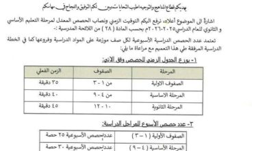 وزارة التربية والتعليم عدن تحدد التوقيت الزمني للحصص الدراسية وعددها في مختلف المراحل