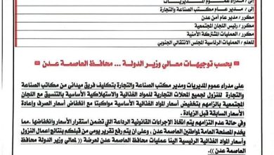 أبين ميديا / لحج – خاص أصدر مكتب الصناعة والتجارة بمحافظة لحج اليوم تعميم ملزم للتجار باسعار المواد الغذائية بحسب…