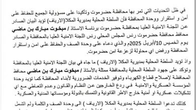 أبين ميديا /المكلا| 10 أبريل 2025م| إعلام السلطة المحلية بمدينة المكلا. أصدرت السلطة المحلية بمديرية مدينة المكلا، اليوم بيان تأييد…