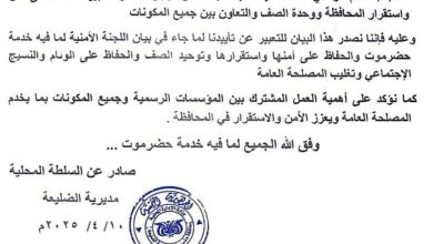 بيان تأييد صادر عن السلطة المحلية بمديرية الضليعة لبيان اللجنة الأمنية العليا بحضرموت
