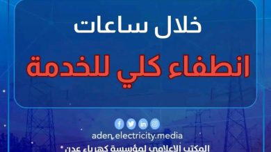 كهرباء عدن: الساعات القادمة ستشهد خروج كلي لمنظومة الكهرباء عن الخدمة