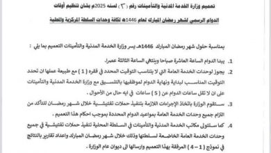أصدرت وزارة الخدمة المدنية والتأمينات، اليوم، تعميماً رقم (3) لسنة 2025م، يحدد أوقات الدوام الرسمي خلال شهر رمضان المبارك لعام…