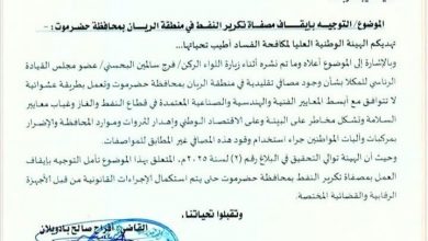 دعت الهيئة العليا لمكافحة الفساد الحكومة اليمنية إلى اتخاذ إجراءات عاجلة لإغلاق المصافي غير الشرعية في منطقة الريان بمحافظة حضرموت، محذرة…
