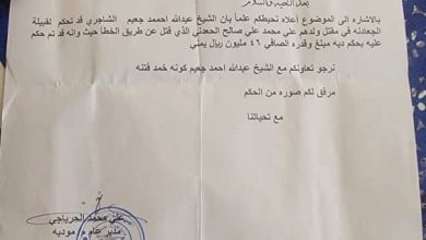 صلح قبلي ينهي قضية قتل في أبين بتحكيم بـ70 مليون ريال