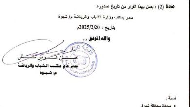 مكتب الشباب و الرياضة بمحافظة #شبوة يلغي القرار السابق بشأن تشكيل فرع اتحاد الرياضة للجميع