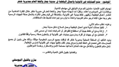 توجيهات صارمة من مدير عام مديرية خنفر لوقف الجبايات في جعار والخط العام(وثيقة )