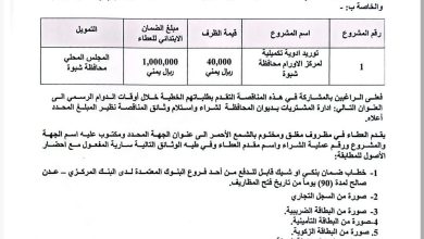 السلطة المحلية بشبوة” تعلن عن مناقصة لتوريد أدوية لمركز علاج الأورام بالمحافظة .